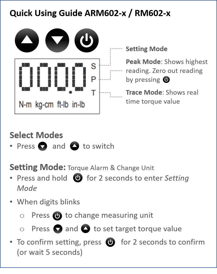Set the Torque Alert Value. See below quick instructions for Changing mode (Peak, Trace, Setup), changing unit, setting Alarm
